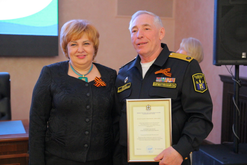 Также министр образования и науки Хабаровского края Хлебникова Виктория наградила победителей краевого конкурса образовательных программ, имеющих целью подготовку обучающихся к военной или иной государственной службы, в том числе к государственной службе российского казачества. В числе награжденных был настоятель храма в честь благоверного князя Александра Невского иерей Василий Диденко.